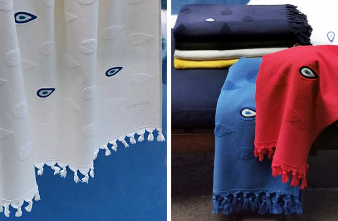 Our new evil eye motif from this season which has a rounder shape, decorates our raffia clutches and linen shirt dresses beautifully.